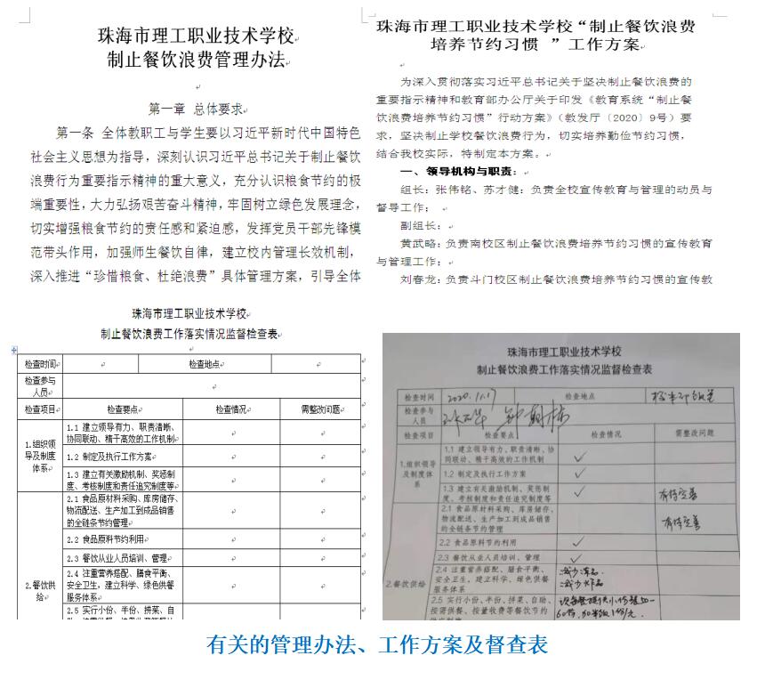 ?為了積極推進(jìn)食堂節(jié)儉用餐,制止餐飲浪費(fèi)行為,學(xué)校迅速響應(yīng)并制定了一系列的監(jiān)督辦法及管理制度。如《珠海市理工職業(yè)技術(shù)學(xué)?!爸浦共惋嬂速M(fèi)培養(yǎng)節(jié)約習(xí)慣 ”工作方案》、《珠海市理工職業(yè)技術(shù)學(xué)校制止餐飲浪費(fèi)管理辦法》、《珠海市理工職業(yè)技術(shù)學(xué)校文明用餐,節(jié)約糧食管理制度》,以及“制止餐飲浪費(fèi)培養(yǎng)節(jié)儉美德”監(jiān)督機(jī)制,多方面健全制度機(jī)制,為活動(dòng)保駕護(hù)航。