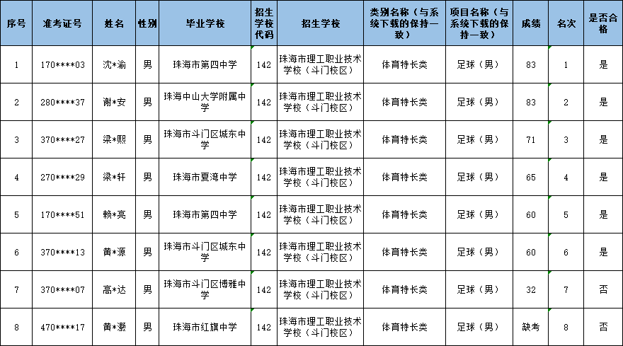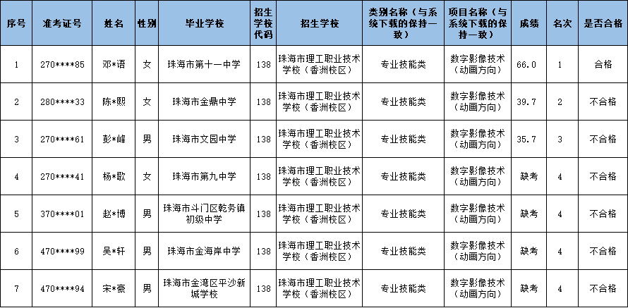 珠海市理工職業(yè)技術(shù)學(xué)校2025年自主招生考察結(jié)果: